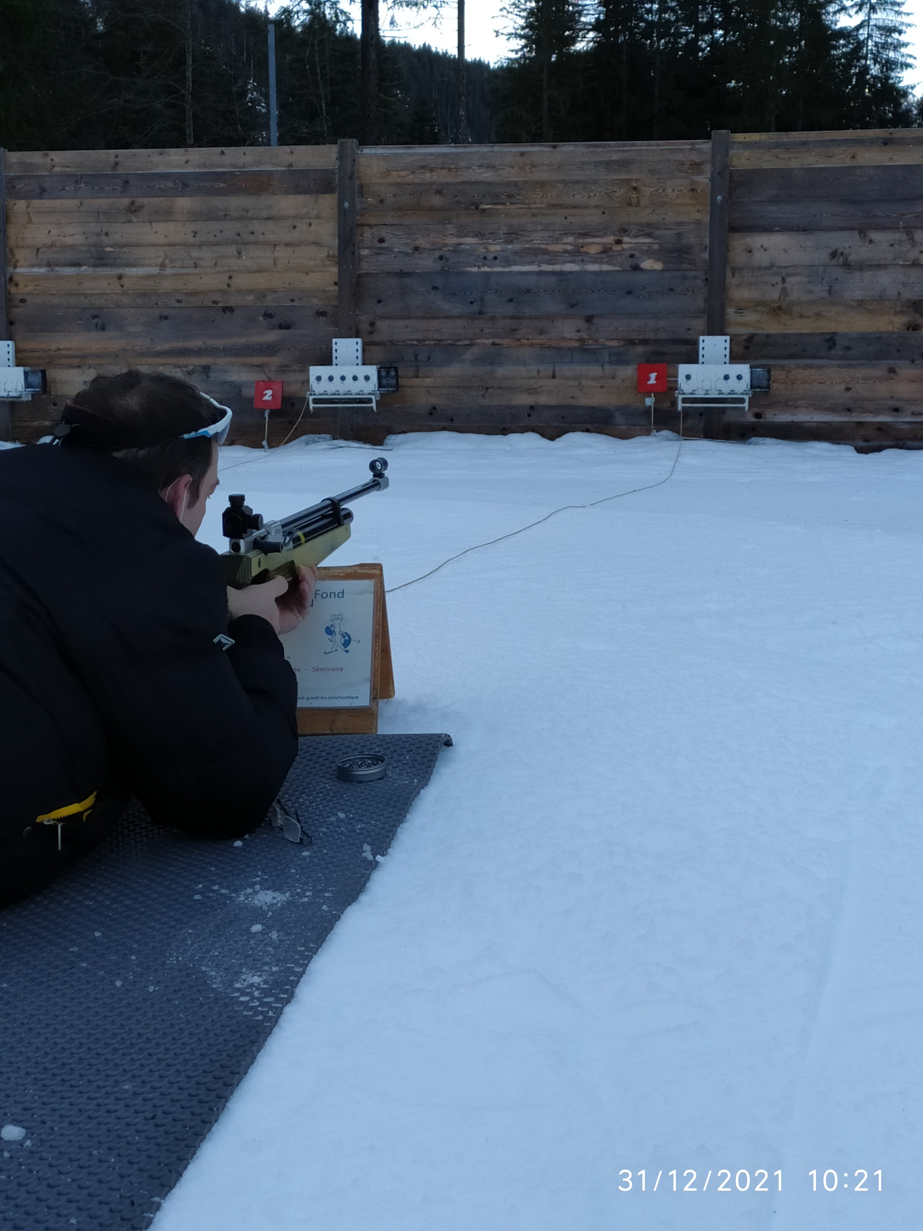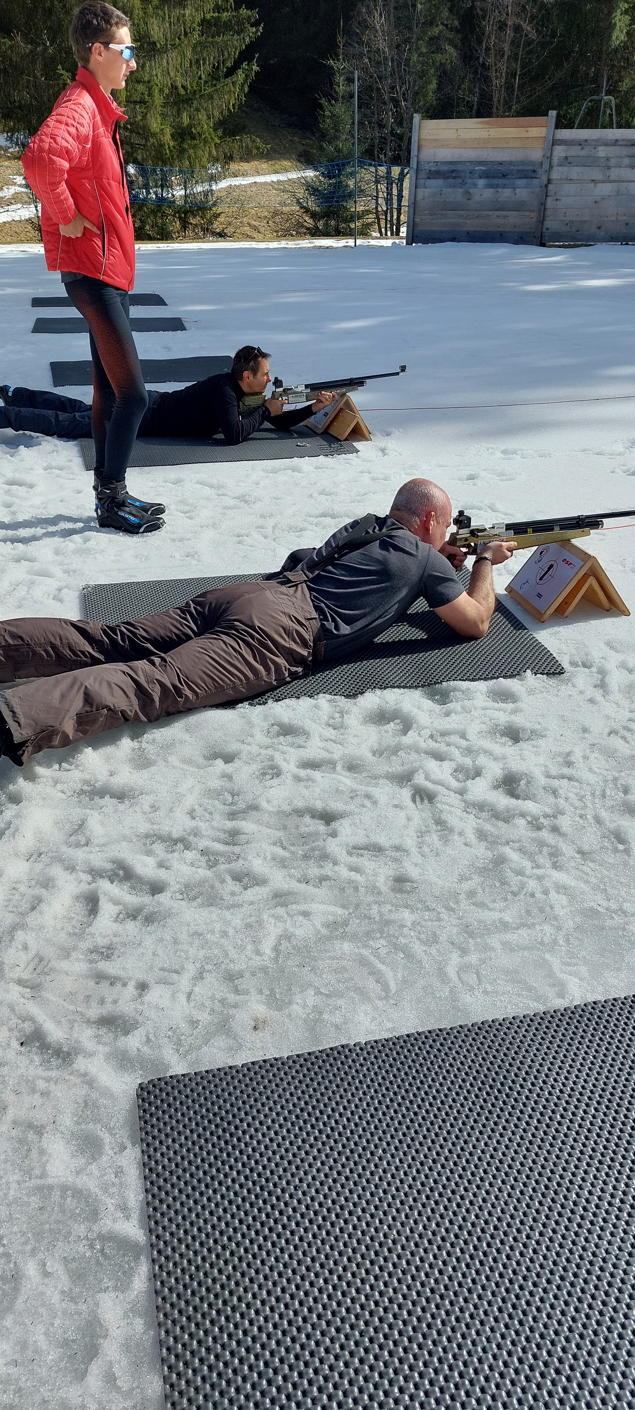 Après avoir passé tout l'hiver à regarder le biathlon sur l'équipe tv, je voulais essayer le tir à la carabine dans les conditions des compétitions. (L'essoufflement du ski en moins). Avec mon épouse nous avons retrouvé une monitrice très sympa et très pédagogue. Au final c'est ma femme qui a fait les meilleurs résultats ...