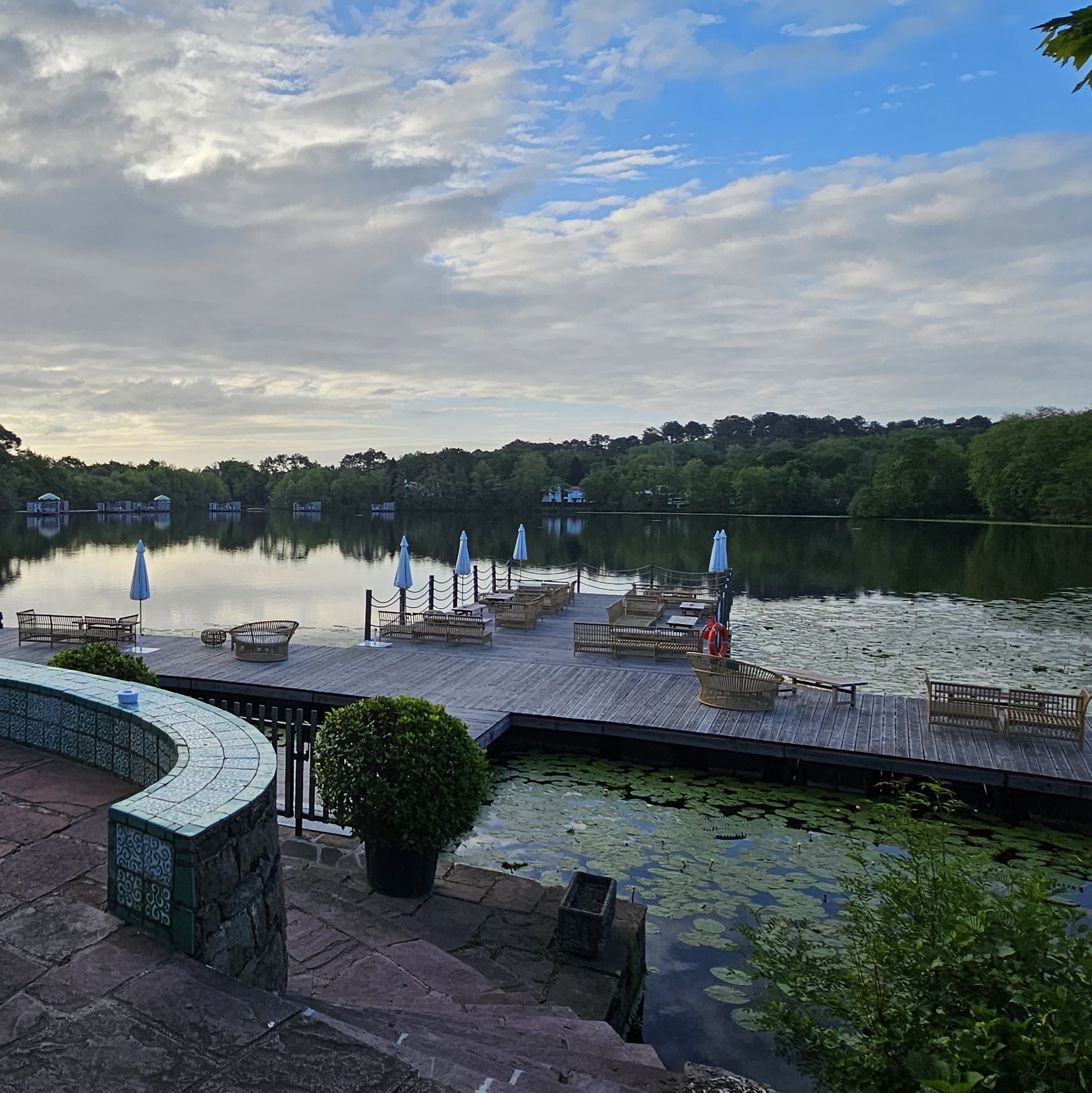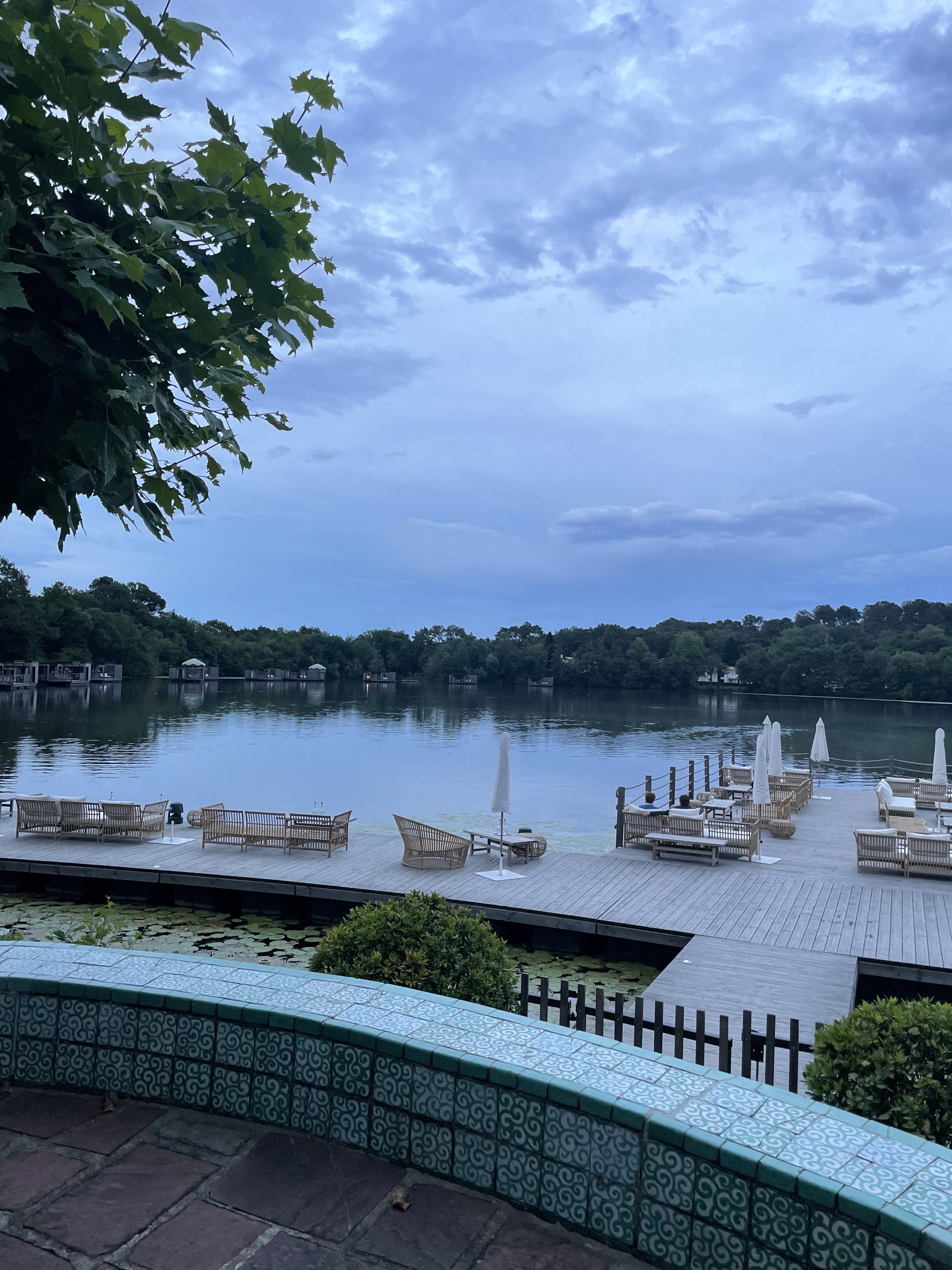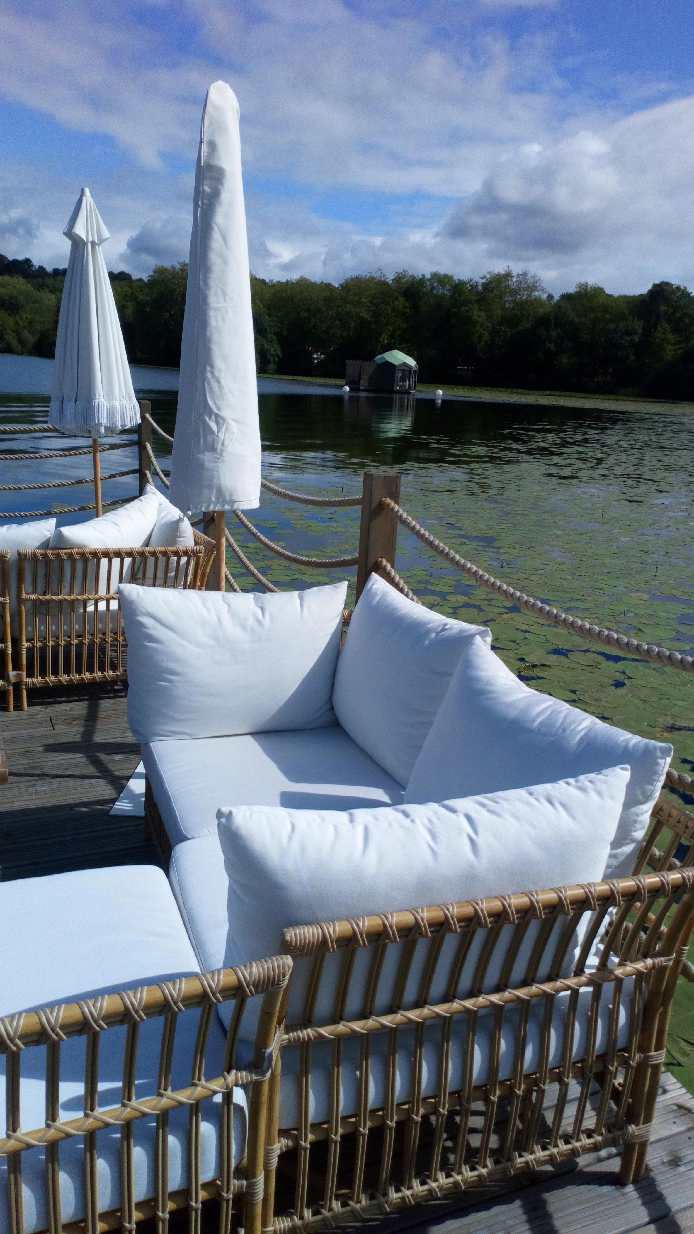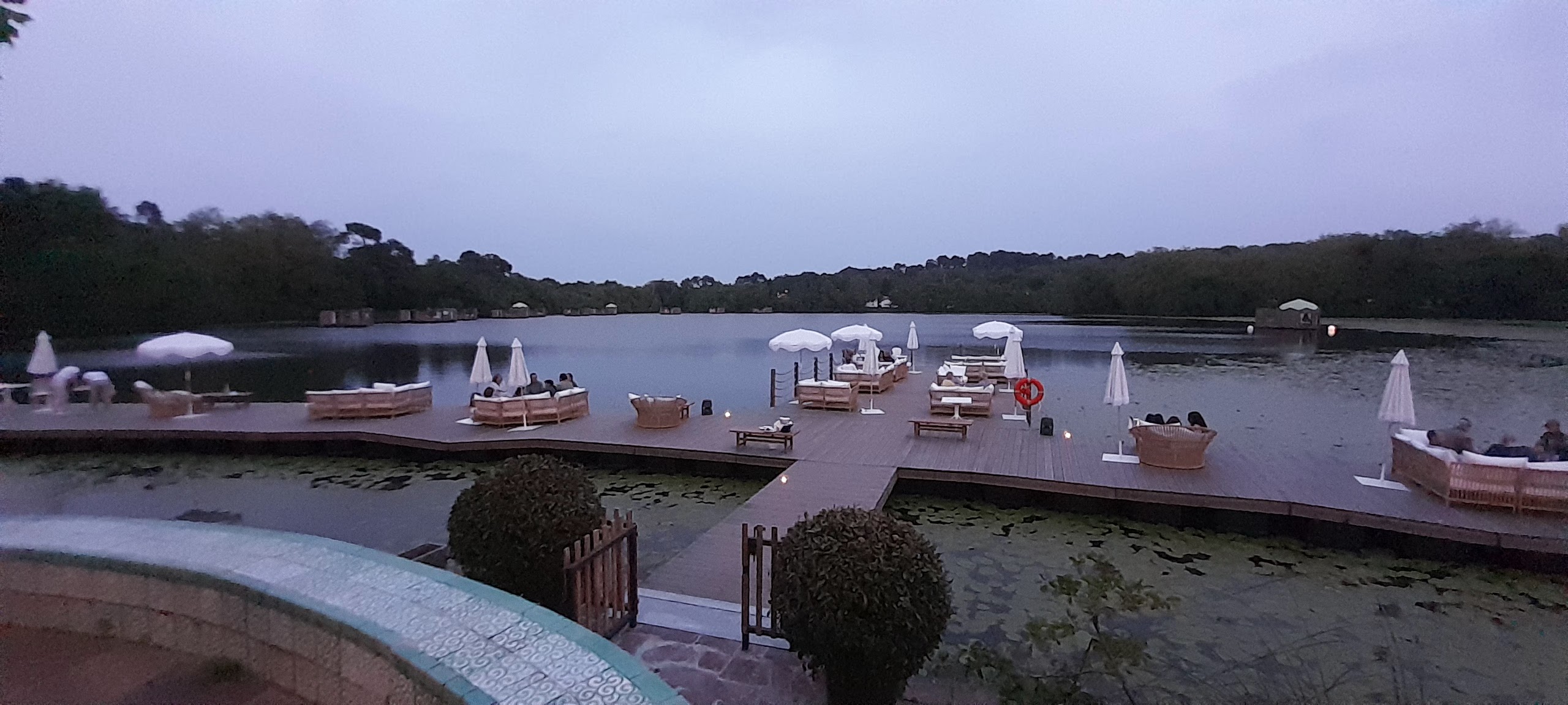 de magnifiques pontons sur le lac avec confortables canapés nous ont accueillis pour prendre un verre à l'extérieur, face aux bungalows sur l'eau, magique ! La prochaine fois, nous essayons le restaurant. Vaut la visite rien que pour le cadre