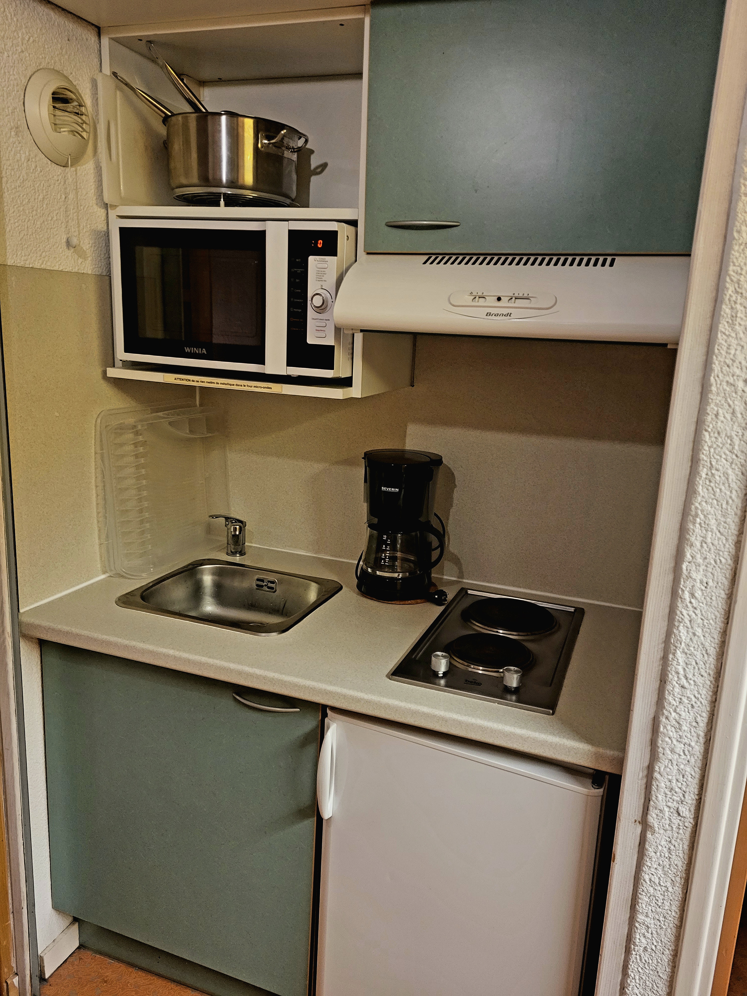 Habitués à la pension complète, nous avons essayé la location...nous avons compris qu'igesa n'aime pas ça. Les points négatifs : Refoulés au dernier bâtiment, à 250m de la station, (en côte, en chaussures de ski, bon courage, ça fait un échauffement) nous étions loin de tout et avons eu l'impression d'être des gueux : la buanderie et l'accueil sont dans le premier bâtiment, notre couloir au dernier étage n'était même pas chauffé, notre chemin menant au ski room nous emmène patauger dans la terre et la boue sur 5metres, et personne n'a l'idée de venir verser un sac de gravier ou d'aménager un chemin en planches, la porte extérieure du skiroom bloque car elle est abimée, mais personne ne vient la réparer, le skiroom et les escaliers ne sont pas nettoyés ( quelqu'un a fait tomber une peau de banane de son sac poubelle, on l'a laissée dans un coin pour voir, et elle est restée dans les escaliers 3 jours )bref... méprisés par rapport au bâtiment 1. Le studio est une pièce minuscule, mais surtout, très mal meublée : vieux meubles encombrants en bois massif type années 80, mal agencé, on se cogne partout alors que, bien pensée, cette pièce pourrait être vivable. La kitchenette est en réalité un placard, fermé par un volet roulant quand les vacanciers sont en pension , et n'est qu'un évier + 2 plaques électriques, pas de place pour autre chose. Un petit frigo et un micro-ondes, pas de bouilloire ni de grille-pain ni, forcément, de lave-vaisselle. Attention, les prises électriques sont fantaisistes, et les 2 seules prises accessibles sont par terre, dans l'entrée. Il est donc impossible d'apporter votre four à raclette, ça ne servirait à rien, la table est trop petite et il n'y a pas de prise à proximité. Les points positifs : La douche est grande et permet de doucher les enfants confortablement. Le balcon est très agréable et il y a un séchoir type Tancarville. Bilan : on ne reviendra pas en location, peut-être en pension, mais ce n'est franchement pas notre Igesa préféré !