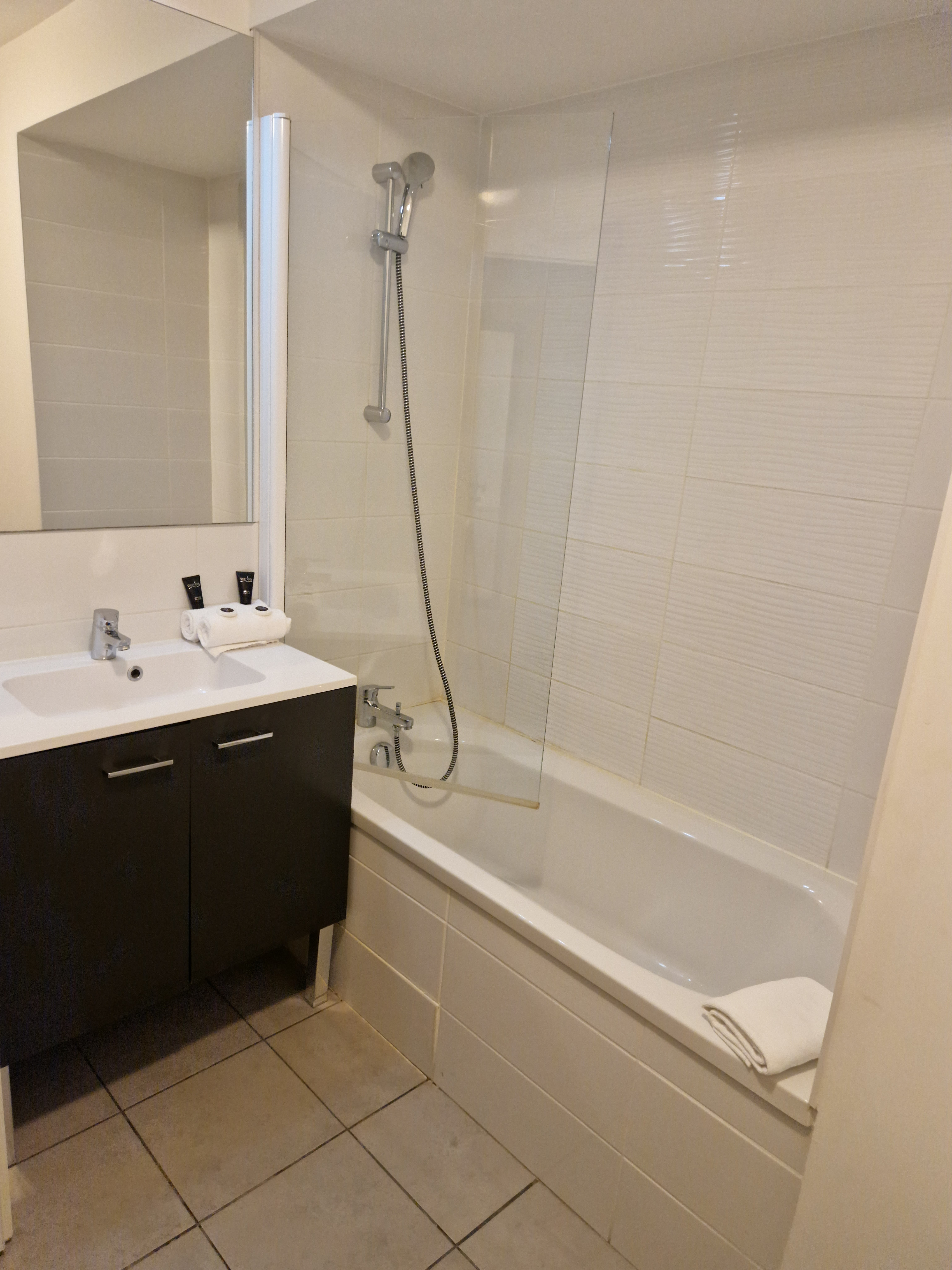 C'est scandaleux : un prix ultra abordable,une literie confortable, une chambre spacieuse, une baignoire , une colonne ventilé, une planche à repasser un fer à repasser un aspirateur une cuisine avec tout le nécessaire pour n'ayons pas peur de le dire 56 euros pour une nuit en plein mois de juillet avec un accès à la piscine chauffée et la salle de sport. Scandaleusement bon marché. Heureusement qu'on ne peut mettre que 5 étoiles sinon j'en aurai mis 6 . Juste le parking payant mais ça c'est qu'un détail vu la qualité de la chambre.