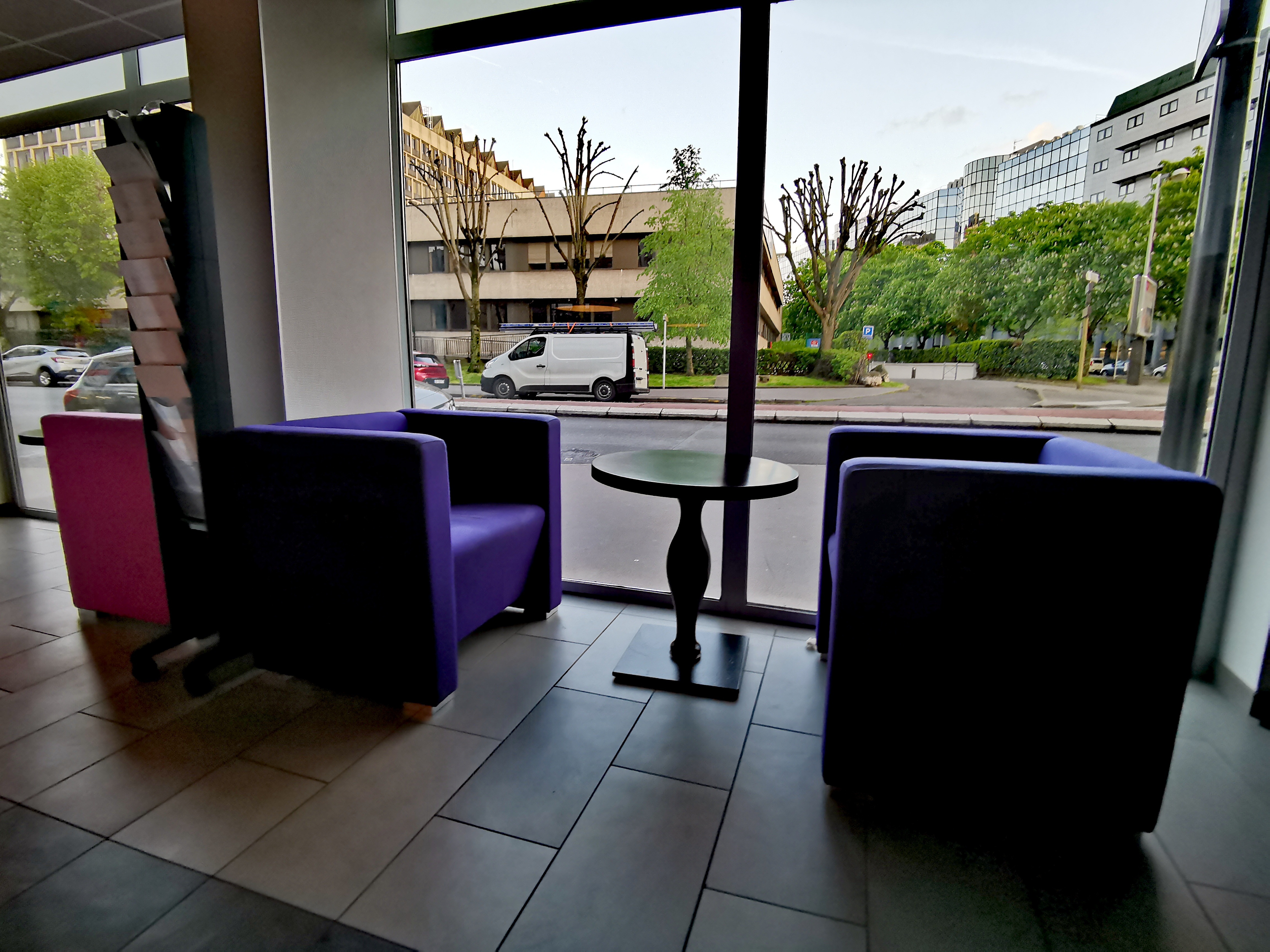 C'est dommage, il n'y a pas de table qui peut se déplacer dans la chambre. Regarder la télé en mangeant sous la télé ce n'est pas top. Il y a 2 chaises dépareillées. Le fait de libérer la chambre pour 10 heures quand on y passe une nuit ça fait un peu tôt. Mais bon c'est dans toute l'hôtellerie toutes catégories confondues que c'est comme ça. Mais c'est vrai on n'en profite pas.