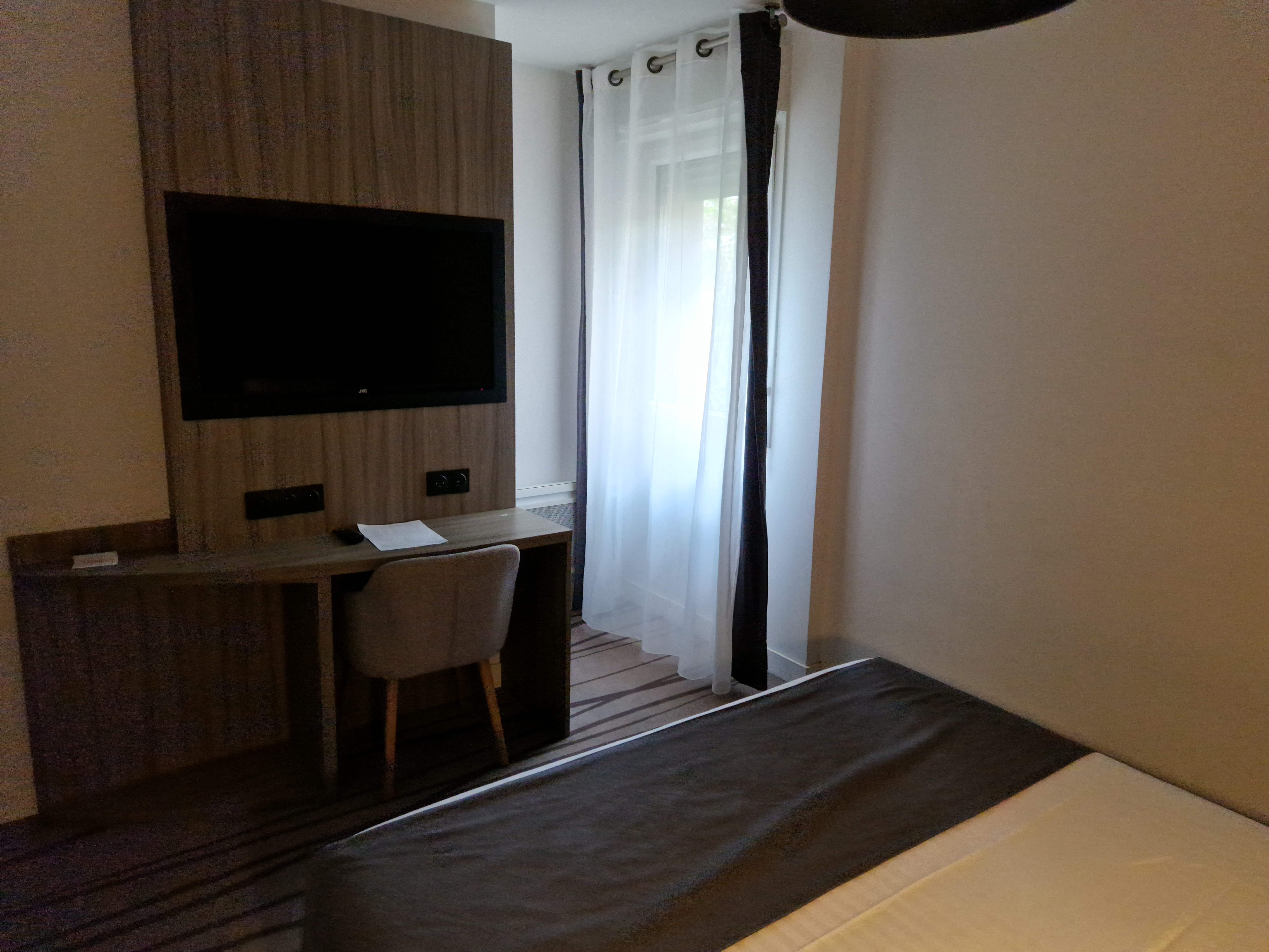 Moquette dégoutante, chambre spacieuse mais pas de table et un pauvre bar pour manger. 2 verres, 2 assiettes et 1 seul bol pour un lave-vaisselle 12 couverts. Matelas inconfortable très fin posé sur des planches de bois. A notre arrivée la receptionniste nous a annoncé que non, il n'y a aucun endroit pour décharger les bagages de la voiture sauf a prendre le risque de bloquer la circulation. Et pas de place au parking, distant de plusieurs centaines de mètres. Le lavabo dans la salle de bains était sale. Chambre au calme sur l'arrière du batiment. Aucun wifi. Une pub pour chromecast mais pas disponible. Nous n'avons pas testé la piscine ou le petit déjeuner.
